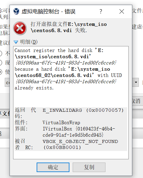because a hard disk 'E:\system_iso\centos68_02\centos6.8.vdi' with UUID {05f096aa-67fc-4191-983d-1ed00fc6cce9} already exists.