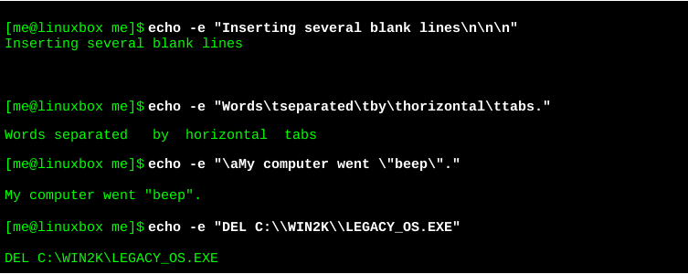 轉(zhuǎn)移字符的應(yīng)用很常見(jiàn)。非常常見(jiàn)轉(zhuǎn)移字符,這個(gè)想法,首先出現(xiàn)在C語(yǔ)言里面。編程語(yǔ)言今天,shell解釋程序,C++,perl,python,awk,tcl和其他程序語(yǔ)言都使用了轉(zhuǎn)移字符這個(gè)概念。通過(guò)使用echo命令的-e選項(xiàng),我們將展示上述轉(zhuǎn)移字符的應(yīng)用: