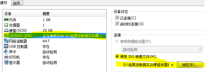 1.掛載iSO鏡像(先打開VM 選擇虛擬機————>設(shè)置——>CD ————>使用ISO鏡像文件 用瀏覽打開)