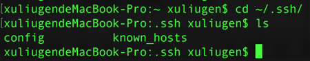 使用cd ~/.ssh/ 進入ssh目錄,會看到有config、known_hosts兩個文件,一般的沒有設(shè)置的話,只會有known_hosts,可以使用touch config命令創(chuàng)建config文件。