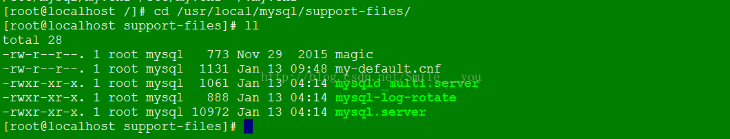 如上圖所示,我們首先切換到mysql安裝目錄的support-files目錄下面,通過(guò)ll命令查看下面的文件信息