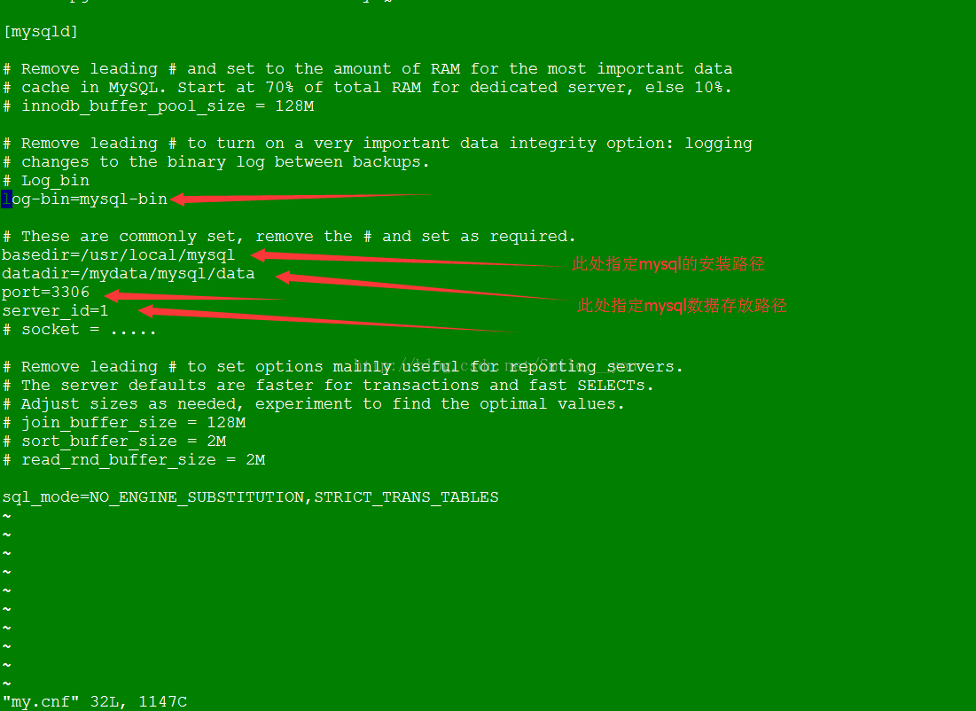 5.編輯my.cnf,指定mysql安裝路徑和mysql數(shù)據(jù)文件存放路徑,下圖還配置了bin-log,配置bin-log的同時(shí)需要指定server_id