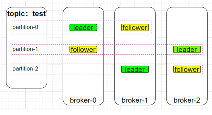 test的描述信息: Topic:test PartitionCount:3 ReplicationFactor:2 Configs:min.insync.replic as=1 Topic: test Partition: 0 Leader: 0 Replicas: 0,1 Isr: 0,1 Topic: test Partition: 1 Leader: 2 Replicas: 2,0 Isr: 2,0 Topic: test Partition: 2 Leader: 1 Replicas: 1,2 Isr: 1,2