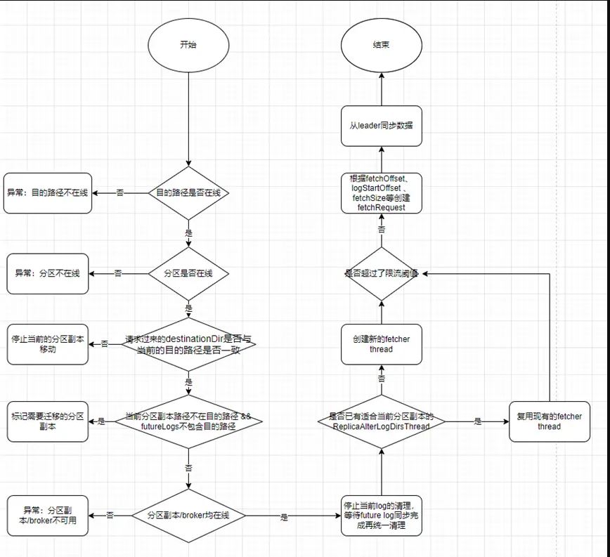 底層數(shù)據(jù)跨路徑遷移,是由 broker 端完成的,broker 接收到客戶端發(fā)來(lái)的 ALTER_REPLICA_LOG_DIRS 請(qǐng)求后,調(diào)用 alterReplicaLogDirs 方法,相關(guān)流程如下: