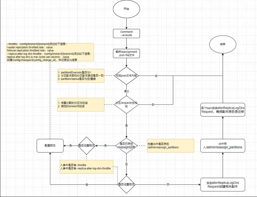 分區(qū)重分配任務(wù)是由客戶端發(fā)起的,其入口主類(lèi)為 ReassignPartitionsCommand.scala 中,調(diào)用 executeAssignment 方法??蛻舳说?executeAssignment 方法主要完成了如下操作: