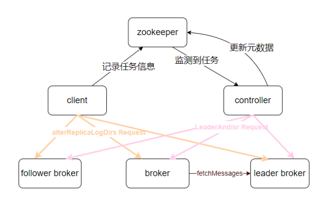 1.客戶端發(fā)起分區(qū)重分配任務(wù),在ZooKeeper中創(chuàng)建/admin/reassign_partitions 節(jié)點(diǎn),然 后向涉及的 broker 發(fā)送 alterReplicaLogDirs 請(qǐng)求