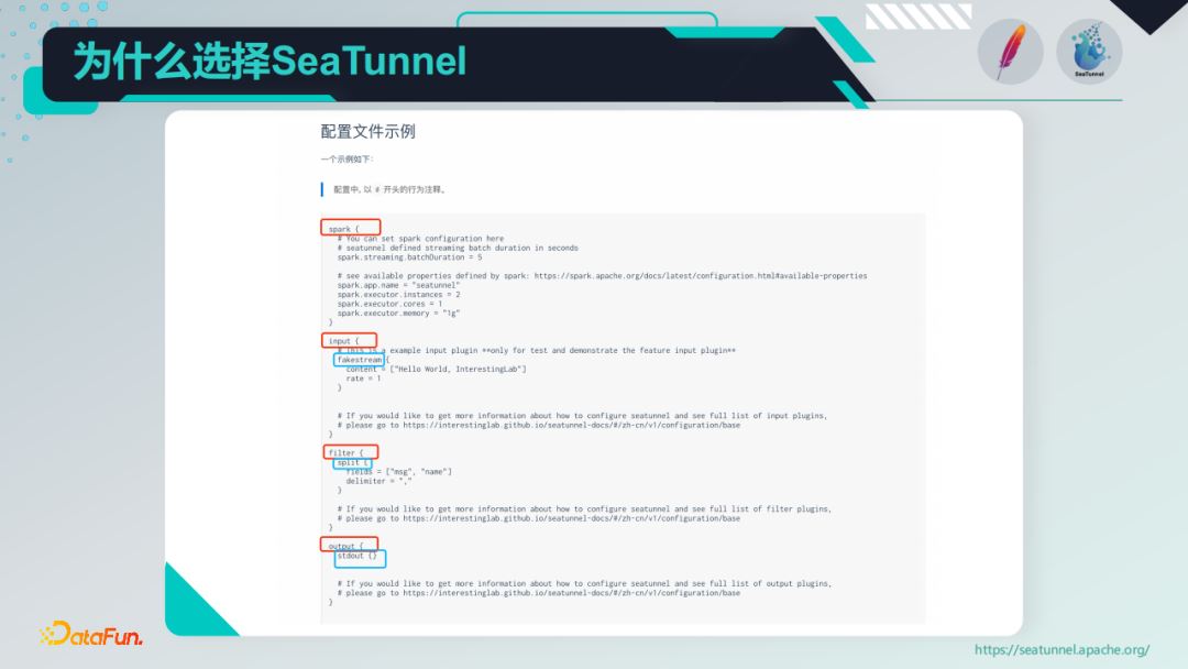 下圖所示是一個配置文件的示例,這個配置文件是SeaTunnel1.X版本的一個配置,一個完整的SeaTunnel配置包含spark, input, filter, output四部分,其中spark是spark相關(guān)的配置,例如,啟動多少個executor,每個 executor使用多少核數(shù)的CPU,多少內(nèi)存等,input可配置任意的input插件及其參數(shù),具體參數(shù)隨不同的input插件而變化,filter可配置任意的filter插件及其參數(shù),具體參數(shù)隨不同的filter插件而變化,filter中的多個插件按配置順序形成了數(shù)據(jù)處理的pipeline, 上一個filter的輸出是下一個filter的輸入,通過input插件把數(shù)據(jù)取出,成為了spark里面的一個數(shù)據(jù)集,然后filter插件會對這個數(shù)據(jù)集做一些轉(zhuǎn)換操作,output可配置任意的output插件及其參數(shù),具體參數(shù)隨不同的output插件而變化,filter處理完的數(shù)據(jù),會發(fā)送給output中配置的每個插件