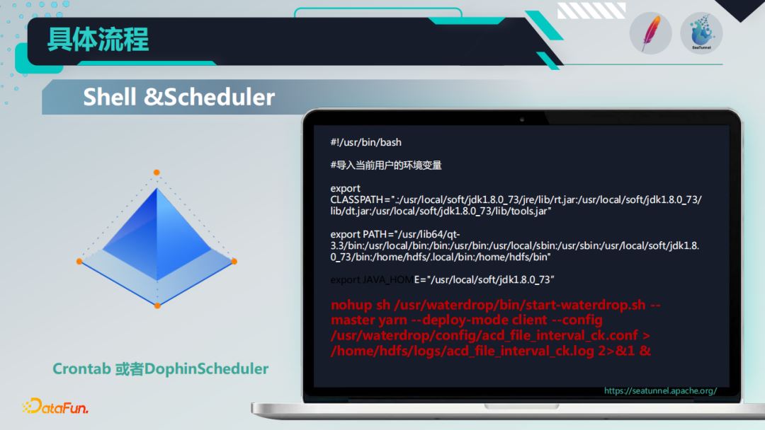 整個過程是通過下圖所示的shell腳本來做的,通過nohup后臺執(zhí)行的方式,利用Crontab進行調(diào)度執(zhí)行,因為在我們實際的業(yè)務(wù)中,對定時調(diào)度的要求不是很高,所以可以采用Crontab或者開源的Dolphin Scheduler都是可以滿足的。