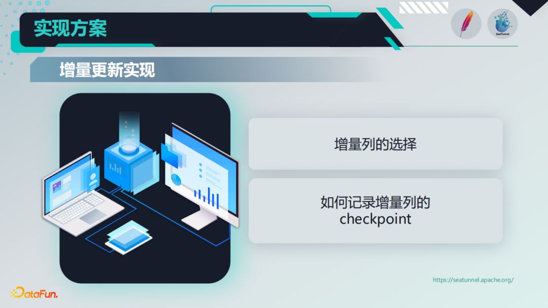 當需要實現(xiàn)一個增量更新的時候,首先就是增量列的選擇,之前提到原先是用NiFi來做增量更新,但是對增量列的支持不是特別好,尤其是對日期類型的支持不是很好。但是SeaTunnel對增量列的支持不受列的類型限制,可以比較靈活的進行選擇。