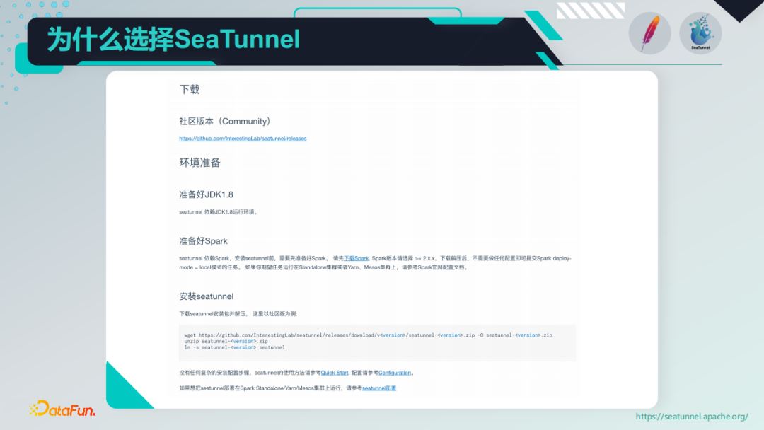 如上圖所示是SeaTunnel官方部署文檔,只需要簡單幾步,就可以把SeaTunnel安裝到我們的環(huán)境之中,然后就可以使用了。