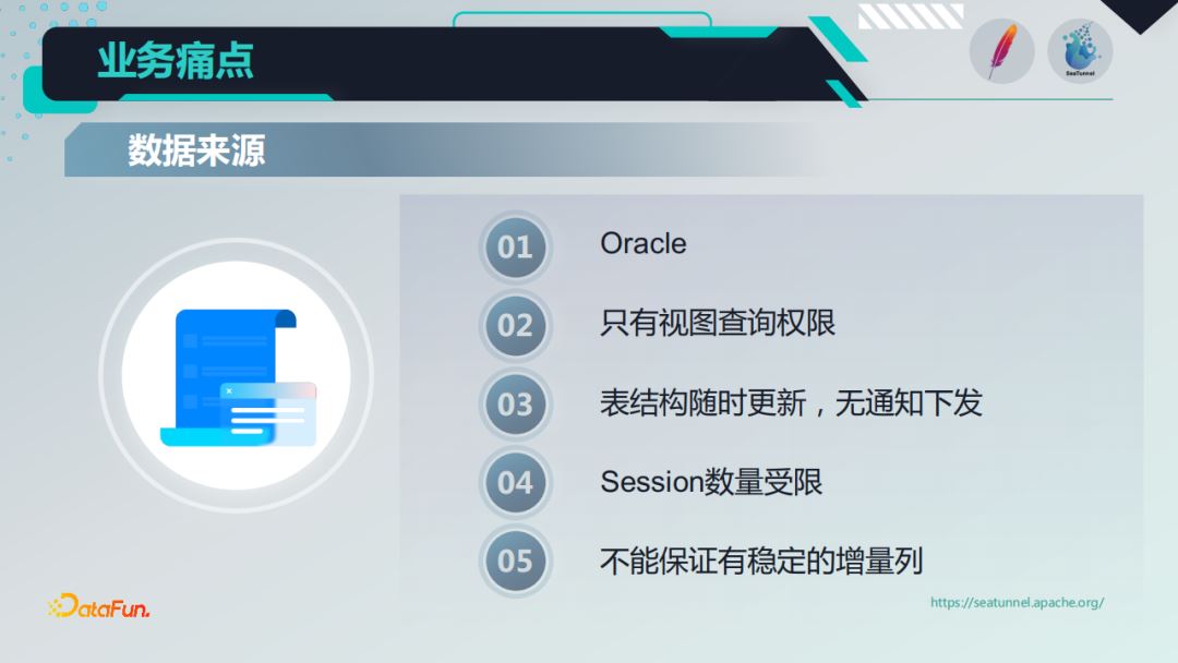 在做業(yè)務(wù)的過程中,會有一些業(yè)務(wù)痛點,首先因為交管行業(yè)是政府行業(yè),基本各個子平臺的數(shù)據(jù)都是存儲在Oracle數(shù)據(jù)庫中的,我們需要把數(shù)據(jù)從Oracle數(shù)據(jù)庫中抽取到我們的數(shù)倉里面,出于安全性的考慮,無法得到用戶級別的權(quán)限,我們只能通過一些視圖級別的用戶權(quán)限去處理數(shù)據(jù),對于數(shù)據(jù)源表結(jié)構(gòu)的變更也無法及時知曉。其次,會話數(shù)是受到限制的,多線程抽取數(shù)據(jù)的話,如果會話數(shù)達到上限,連接就會受到影響,而且這個分配的用戶也同時會用于其他用途。最后,我們在處理一些增量數(shù)據(jù)的時候,一般情況下需要一個增量列,用于保持一個增量更新,很多時候,是沒辦法確定哪些列可以作為增量列的。以上就是在做業(yè)務(wù)的過程中,經(jīng)常會遇到的一些問題,下圖也把這些問題列舉了出來。