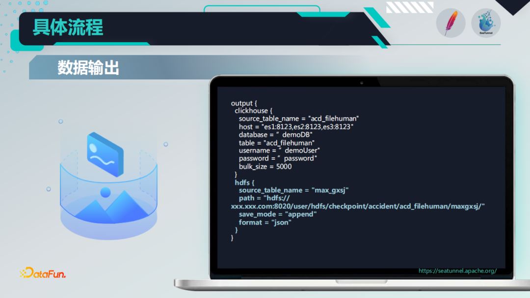 下圖所示的是數(shù)據(jù)處理后的輸出,也就是output插件對應(yīng)的配置,具體是把數(shù)據(jù)抽取到Clickhouse里面。然后數(shù)據(jù)集里面,那個更新列的最大值,通過追加模式,寫回到HDFS中,供下次使用。