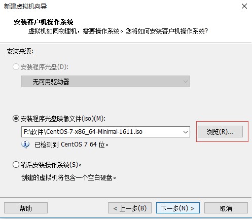 四、在安裝客戶機(jī)操作系統(tǒng)界面,選擇安裝程序光盤鏡像文件(這里選擇用iso文件進(jìn)行安裝)選項(xiàng),該選項(xiàng)右側(cè)的“瀏覽”按鈕可以選擇iso文件的存放路徑,返回點(diǎn)擊“下一步”: