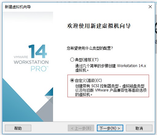 二、在選擇虛擬機(jī)配置界面選擇“自定義(高級(jí))”選項(xiàng),然后點(diǎn)擊“下一步”