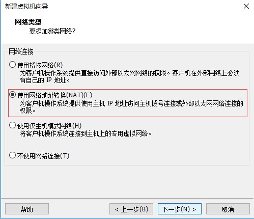 八、進(jìn)入選擇網(wǎng)絡(luò)類型界面,這里選擇默認(rèn)配置(虛擬機(jī)安裝好以后可以在根據(jù)自己需要更改網(wǎng)絡(luò)配置),然后點(diǎn)擊“下一步”: