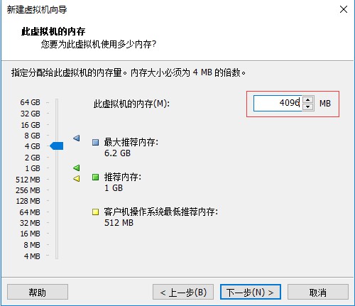七、進(jìn)入虛擬機(jī)內(nèi)存配置界面,這里選擇給虛擬機(jī)分配4G的內(nèi)存(默認(rèn)配置是1G內(nèi)存),然后點(diǎn)擊“下一步”: