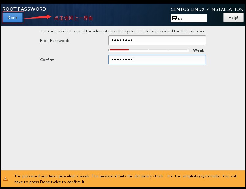 二十一、給root用戶創(chuàng)建密碼,然后點(diǎn)擊左上角的“Done”按鈕返回上一界面: