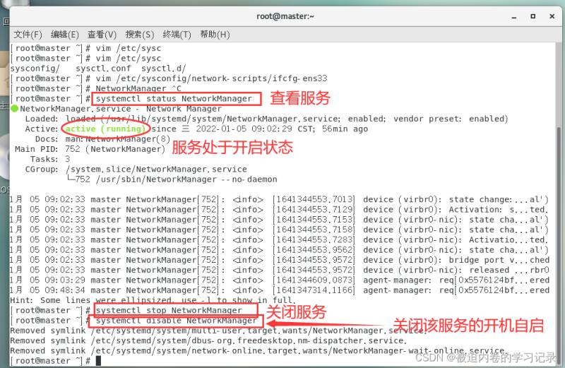 systemctl disable NetworkManager:關(guān)閉該服務(wù)的開機(jī)自啟功能