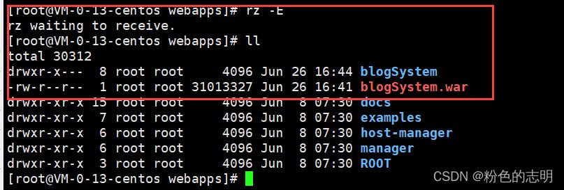 一個字: 拖!把剛剛的 war 包拖到我們云服務(wù)器的 webapps目錄下,tomcat如果在運行中,就會自動對 war 進行解壓縮