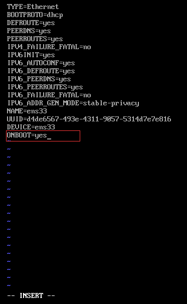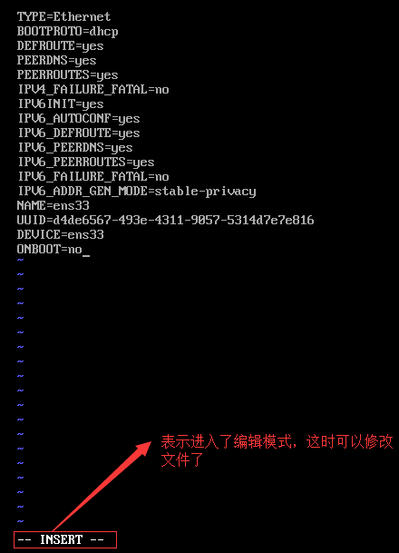 修改ONBOOT的值。按住鍵盤的方向鍵可以上下左右跳到光標(biāo)的順序。將光標(biāo)移動(dòng)到ONBOOT,并按一次鍵盤上面的“i”,表示進(jìn)入編輯模式: