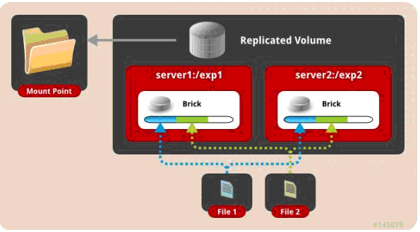 二、 復(fù)制模式,既AFR, 創(chuàng)建volume 時(shí)帶 replica x 數(shù)量: 將文件復(fù)制到 replica x 個(gè)節(jié)點(diǎn)中。