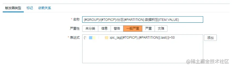 }自動發(fā)現(xiàn)中的GROUP、TOPIC、PARTITION 這三個信息可以用于進一步過濾不同的分區(qū)的Lag值和監(jiān)控系統(tǒng)中的監(jiān)控項名稱: