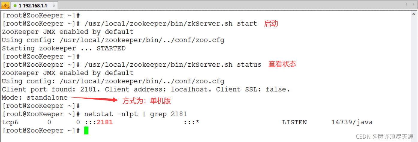 [root@ZooKeeper ~]# /usr/local/zookeeper/bin/zkServer.sh start # 啟動(dòng) [root@ZooKeeper ~]# /usr/local/zookeeper/bin/zkServer.sh status # 查看狀態(tài)