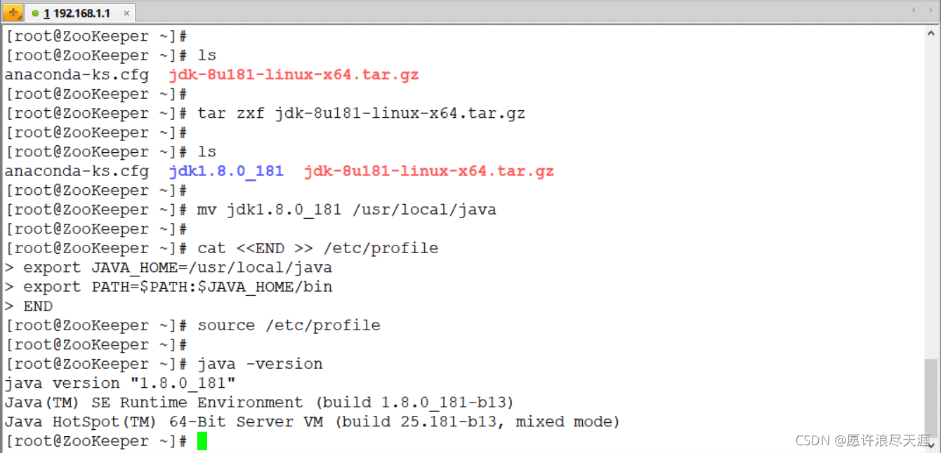 [root@ZooKeeper ~]# ls anaconda-ks.cfg jdk-8u181-linux-x64.tar.gz [root@ZooKeeper ~]# tar zxf jdk-8u181-linux-x64.tar.gz [root@ZooKeeper ~]# ls anaconda-ks.cfg jdk1.8.0_181 jdk-8u181-linux-x64.tar.gz [root@ZooKeeper ~]# mv jdk1.8.0_181 /usr/local/java [root@ZooKeeper ~]# cat <<END >> /etc/profile export JAVA_HOME=/usr/local/java export PATH=$PATH:$JAVA_HOME/bin END [root@ZooKeeper ~]# source /etc/profile [root@ZooKeeper ~]# java -version