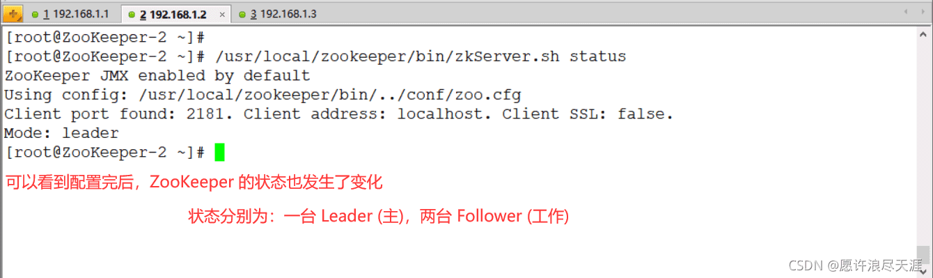 [root@ZooKeeper ~]# cat <<END >> /usr/local/zookeeper/conf/zoo.cfg server.1=192.168.1.1:2888:3888 server.2=192.168.1.2:2889:3889 server.3=192.168.1.3:2890:3890 END