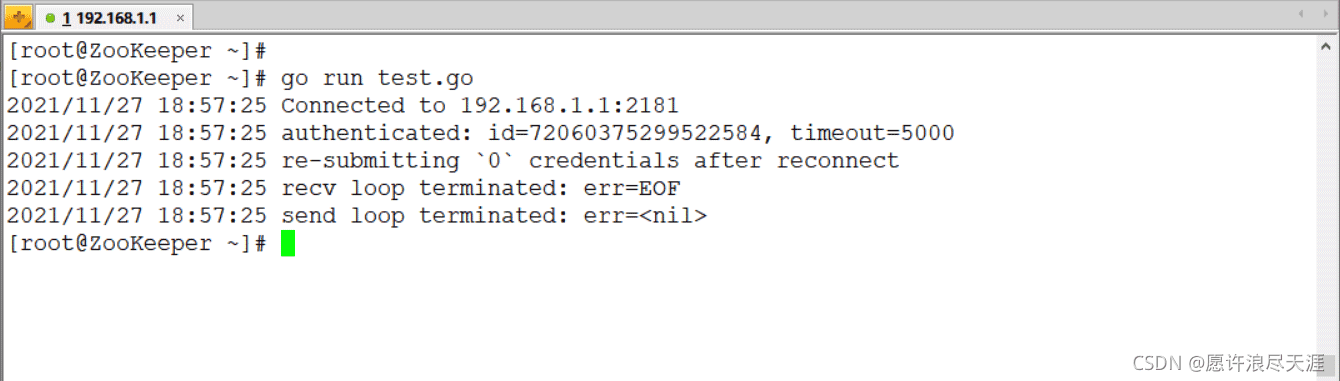 [root@ZooKeeper ~]# git clone https://github.com/samuel/go-zookeeper.git [root@ZooKeeper ~]# mv go-zookeeper /usr/local/go/src/