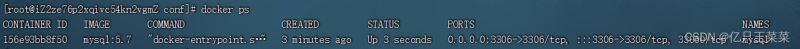 -d:該容器在后臺(tái)運(yùn)行-p 3306:3306:容器與主機(jī)映射端口為,主機(jī)3306,容器3306--name mysql:容器運(yùn)行后的名稱-v /mysqldata/mysql/log:/var/log/mysql:將容器/var/log/mysql目錄下的數(shù)據(jù),備份到主機(jī)的 /mysqldata/mysql/log目錄下-v /mysqldata/mysql/data:/var/lib/mysql:將容器/var/lib/mysql目錄下的數(shù)據(jù),備份到主機(jī)的 /mysqldata/mysql/data目錄下-v /mysqldata/mysql/conf:/etc/mysql:將容器/etc/mysql目錄下的數(shù)據(jù),備份到主機(jī)的 mysqldata/mysql/conf目錄下-e MYSQL_ROOT_PASSWORD=root:設(shè)置當(dāng)前mysql實(shí)例的密碼為rootmysql:5.7:需要運(yùn)行的容器名稱以及版本號(hào)