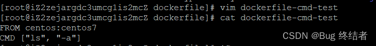 # 進(jìn)入dockerfile 目錄,新建dockerfile-cmd-test文件 FROM centos:centos7 CMD ["ls", "-a"]
