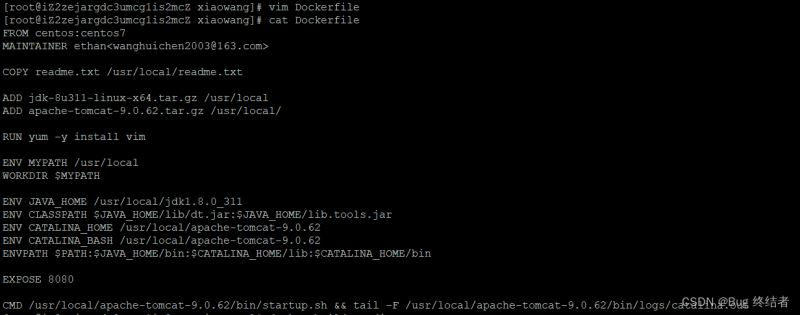 vim Dockerfile # 寫入以下文件 FROM centos:centos7 MAINTAINER ethan<wanghuichen2003@163.com> COPY readme.txt /usr/local/readme.txt ADD jdk-8u311-linux-x64.tar.gz /usr/local ADD apache-tomcat-9.0.62.tar.gz /usr/local/ RUN yum -y install vim ENV MYPATH /usr/local WORKDIR $MYPATH ENV JAVA_HOME /usr/local/jdk1.8.0_311 ENV CLASSPATH $JAVA_HOME/lib/dt.jar:$JAVA_HOME/lib.tools.jar ENV CATALINA_HOME /usr/local/apache-tomcat-9.0.62 ENV CATALINA_BASH /usr/local/apache-tomcat-9.0.62 ENVPATH $PATH:$JAVA_HOME/bin:$CATALINA_HOME/lib:$CATALINA_HOME/bin EXPOSE 8080 CMD /usr/local/apache-tomcat-9.0.62/bin/startup.sh && tail -F /usr/local/apache-tomcat-9.0.62/bin/logs/catalina.out