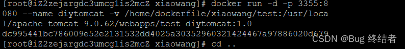 # 啟動容器,外部端口3355映射內(nèi)部容器8080 重命名容器名稱,掛載鏡像 docker run -d -p 3355:8080 --name diytomcat -v /home/dockerfile/xiaowang/test:/usr/local/apache-tomcat-9.0.62/webapps/test diytomcat:1.0