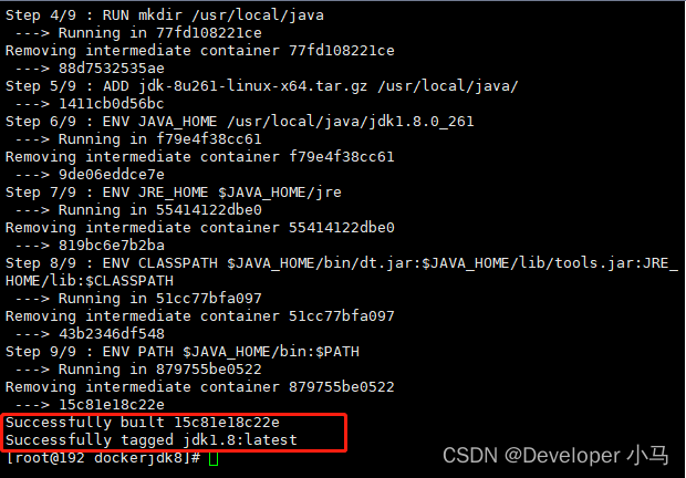 [root@192 dockerjdk8]# docker build -t='jdk1.8' . # -t 指定鏡像名稱 # . 代表當(dāng)前目錄,會(huì)自動(dòng)到當(dāng)前目錄尋找 Dockerfile 文件