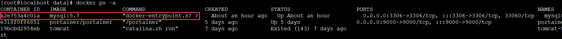 [root@localhost ~]# docker run -d -p 3306:3306 -v /home/mysql/conf:/etc/mysql/conf.d -v /home/mysql/data:/var/lib/mysql -e MYSQL_ROOT_PASSWORD=123456 --name mysql01 mysql:5.7 a2e753a4c01a3992e24f08098ca16ebf0ecce01279c88976ce8ad43b5ac0a987