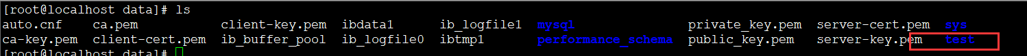 [root@localhost mysql]# cd data/ [root@localhost data]# ls auto.cnf ca.pem client-key.pem ibdata1 ib_logfile1 mysql private_key.pem server-cert.pem sys ca-key.pem client-cert.pem ib_buffer_pool ib_logfile0 ibtmp1 performance_schema public_key.pem server-key.pem