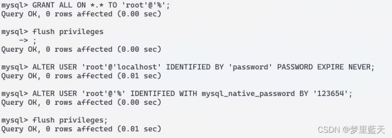 GRANT ALL ON *.* TO 'root'@'%';//遠(yuǎn)程連接 flush privileges; //刷新權(quán)限 ALTER USER 'root'@'localhost' IDENTIFIED BY 'password' PASSWORD EXPIRE NEVER;//更改加密規(guī)則 ALTER USER 'root'@'%' IDENTIFIED WITH mysql_native_password BY '123654';//設(shè)置密碼 flush privileges;//刷新權(quán)限