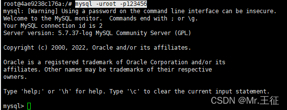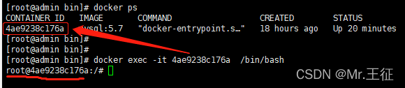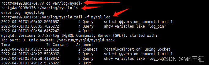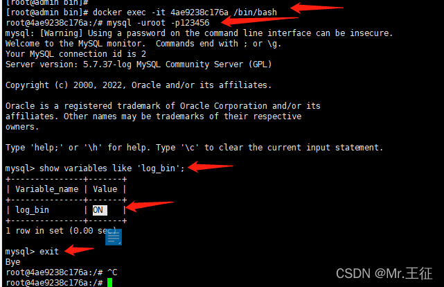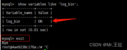 docker exec -it 4ae9238c176a /bin/bash mysql -uroot -p123456 show variables like 'log_bin'; exit