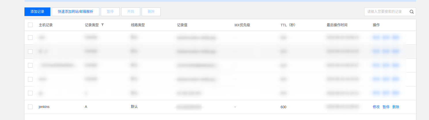 這里設(shè)置的jenkins是域名的前綴,可以以此來區(qū)分不同的服務。記錄值中填寫服務器的公網(wǎng)IP。