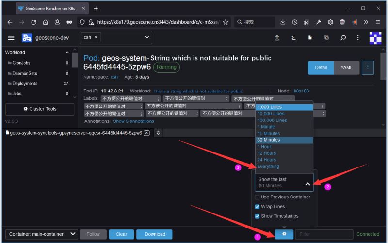 有時(shí)候,我們?cè)趓ancher2.6查看某個(gè)pod的指定容器的日志時(shí),發(fā)現(xiàn)日志框是完全空白的,看不到任何日志信息,而通過kubectl logs,或者docker logs卻能看到不少日志信息。這大概率是因?yàn)閞ancher頁面右下方是日志篩選范圍沒有進(jìn)行恰當(dāng)?shù)脑O(shè)置,默認(rèn)情況下,rancher2.6只顯示最近30分鐘的日志。所以如果不手動(dòng)調(diào)整一下,就很容易看不到想要日志。設(shè)置方式如下圖所示: