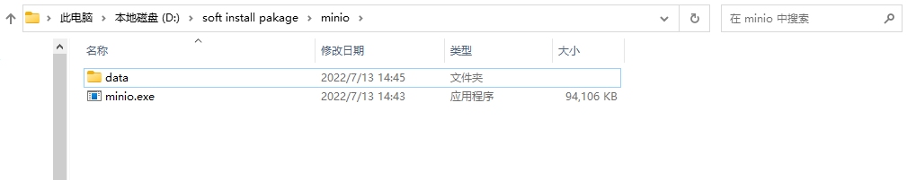 二、新建一個(gè)文件夾用于存放minio.exe 同時(shí)新增一個(gè)data文件夾用于存放文件
