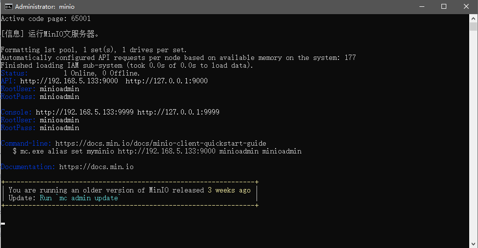@echo off REM 聲明采用UTF-8編碼 chcp 65001 echo. echo [信息] 運(yùn)行MinIO文服務(wù)器。 echo. title minio cd %~dp0 cd D:\soft-install-pakage\minio minio.exe server D:\soft-install-pakage\minio\data --console-address ":9999" pause