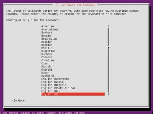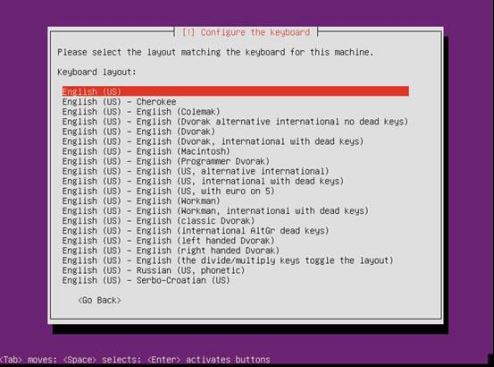 步驟 9: 進(jìn)入鍵盤配置界面,選擇English(US),按Enter。