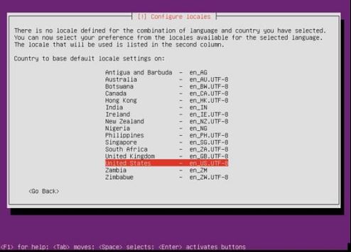 步驟 8: 進(jìn)入地理位置語(yǔ)言配置界面,選擇United Ststes - en_US.UTF-8,按Enter。