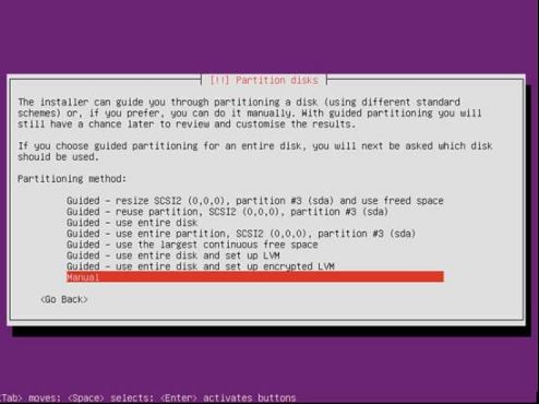 步驟 14:進(jìn)入分區(qū)界面,選擇Manual手動(dòng)分區(qū),按Enter。