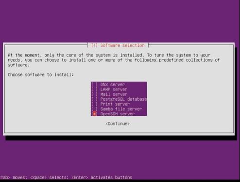 步驟 20: 進(jìn)入軟件設(shè)置界面,根據(jù)需求選擇需要安裝的軟件包,后選擇Continue,按Enter。
