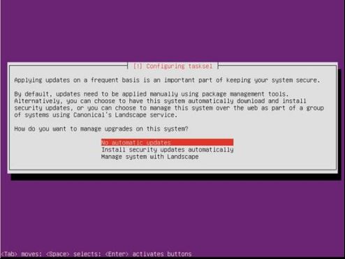 步驟 19: 進(jìn)入更新設(shè)置界面,選擇No automatic updates,按Enter。