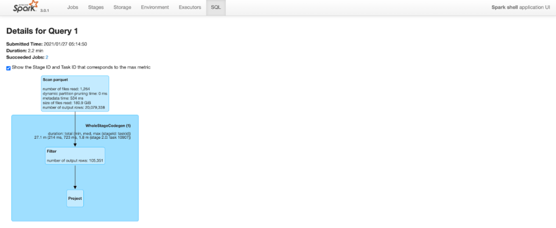查詢花費(fèi)了2.2分鐘。請(qǐng)注意查詢計(jì)劃的"掃描parquet"部分中的輸出行數(shù)包括表中的所有2000W行。