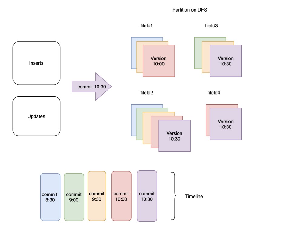 該圖顯示了 DFS 上的一個特定分區(qū),其中提交和相應的文件版本是彩色編碼的。在該分區(qū)中創(chuàng)建了 4 個不同的文件組,如 fileId1、fileId2、fileId3 和 fileId4 所示。 fileId2 對應的文件組包含所有 5 次提交的記錄,而 fileId4 對應的組僅包含最近 2 次提交的記錄。
